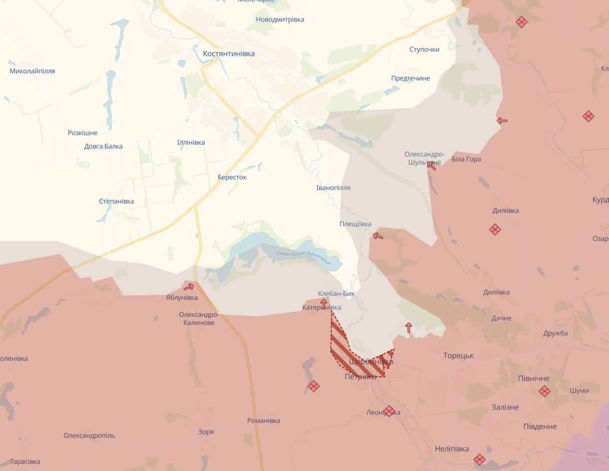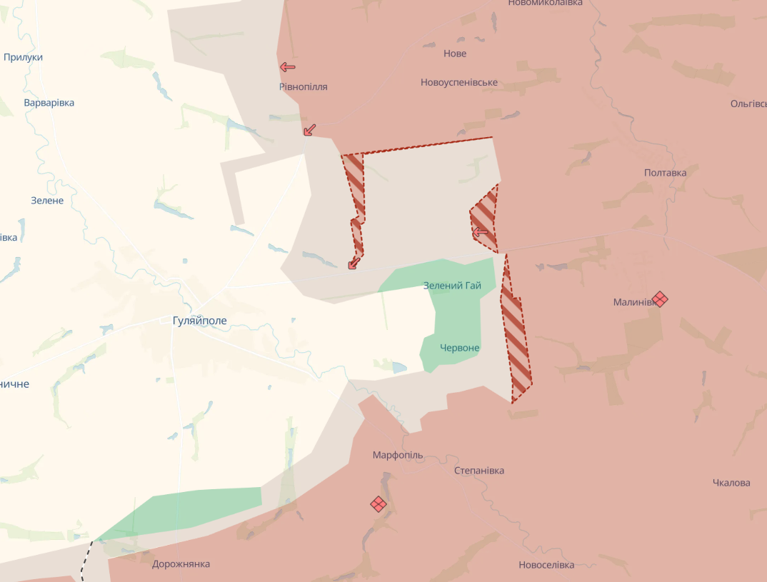 По карті видно загрозу оточення українських бійців у районі Зеленого Гаю на гуляйпільському напрямку. Росіяни просунулися на південь, що дозволило противнику скоротити відстань на виході з цієї ділянки приблизно до 3 км.