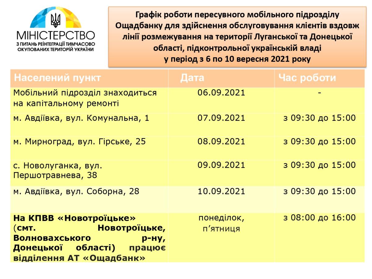 На этой неделе на Донбасс приедет мобильное подразделение «Ощадбанка», которое будет предоставлять банковские услуги гражданам в Мирнограде, Новолуганском и Авдеевке с 7 по 10 сентября. Об этом сообщает пресс-служба Министерства по вопросам реинтеграции временно оккупированных территорий.