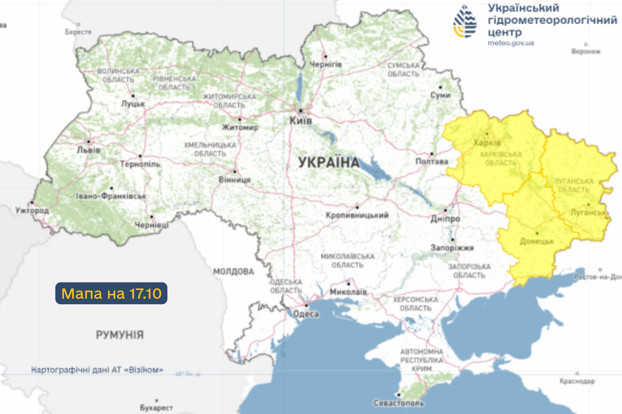 Заморозки будуть уночі 15, 16 та 17 жовтня. На карті жовтим відмічені регіони, де вони очікуються.