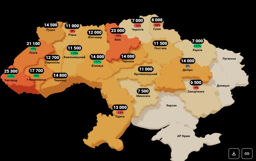 Найсильніше падіння цін зафіксовано у Сумах. Однокімнатні квартири подешевшали на 28% (до 6500 грн), а двокімнатні — на 33% (до 8000 грн).